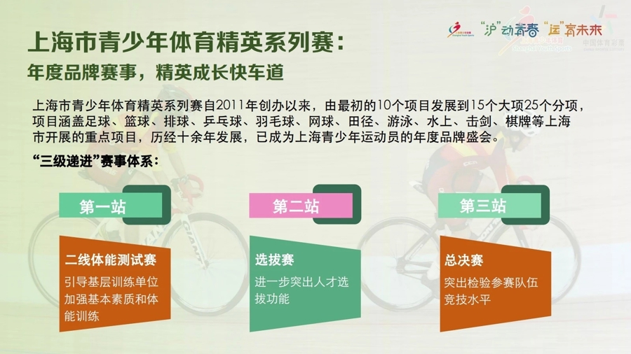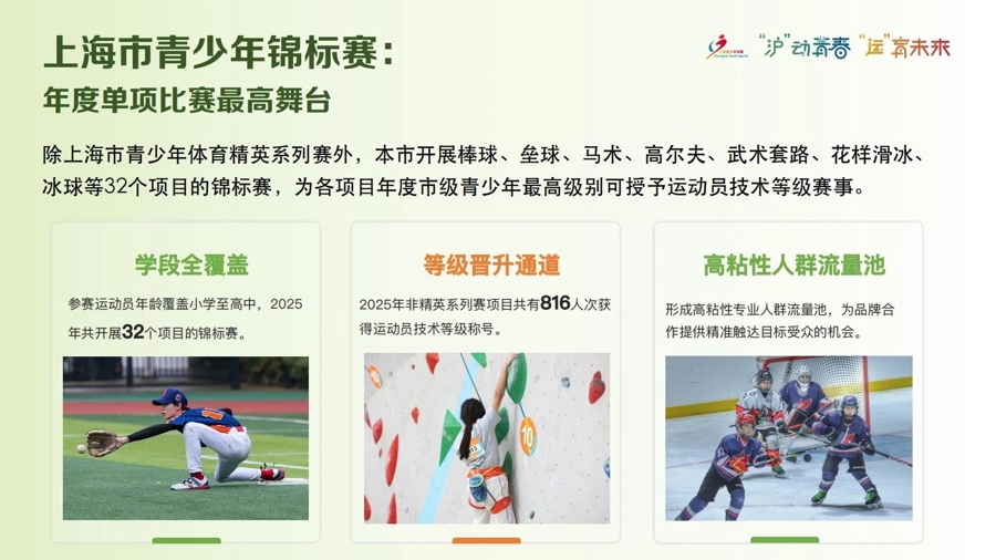 上海市青少年体育赛事体系经过多年精心构建,已形成贯穿全年、覆盖全域、连接全龄的立体化竞赛活动金字塔体系,包括市运会、单项青少年锦标赛、青少年精英系列赛、青少年体育俱乐部联赛、少儿体育联赛等品牌赛事活动。