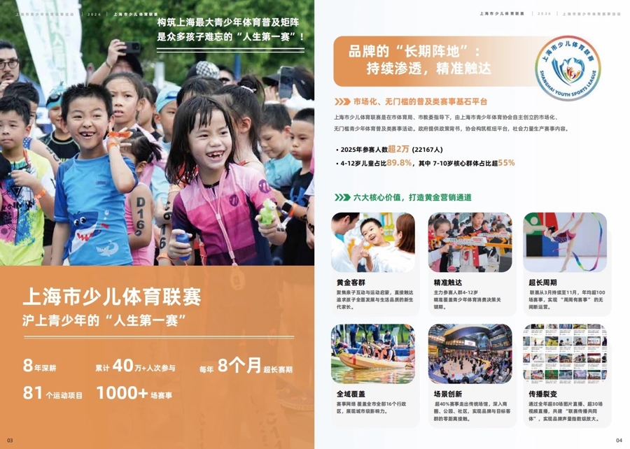 上海市青少年体育俱乐部联赛。搭建无门槛参赛平台,兼顾专业性与普惠性,通过积分体系、跨场景办赛等创新模式,推动体育与消费融合,助力青少年体育素养提升与后备人才发掘。上海市少儿体育联赛。覆盖全年超百场的市场化、无门槛赛事,为青少年提供从“体验”到“持续参与”的路径,深度沉淀体育人口。两大类赛事活动全年举办超过400场,参与人群近百万人次,项目覆盖夏季、冬季奥运会及全运会竞技项目、智力运动和多项新兴运动项目,真正实现了“全项目覆盖、青少年全年龄段参与、全竞技水平开放”。
